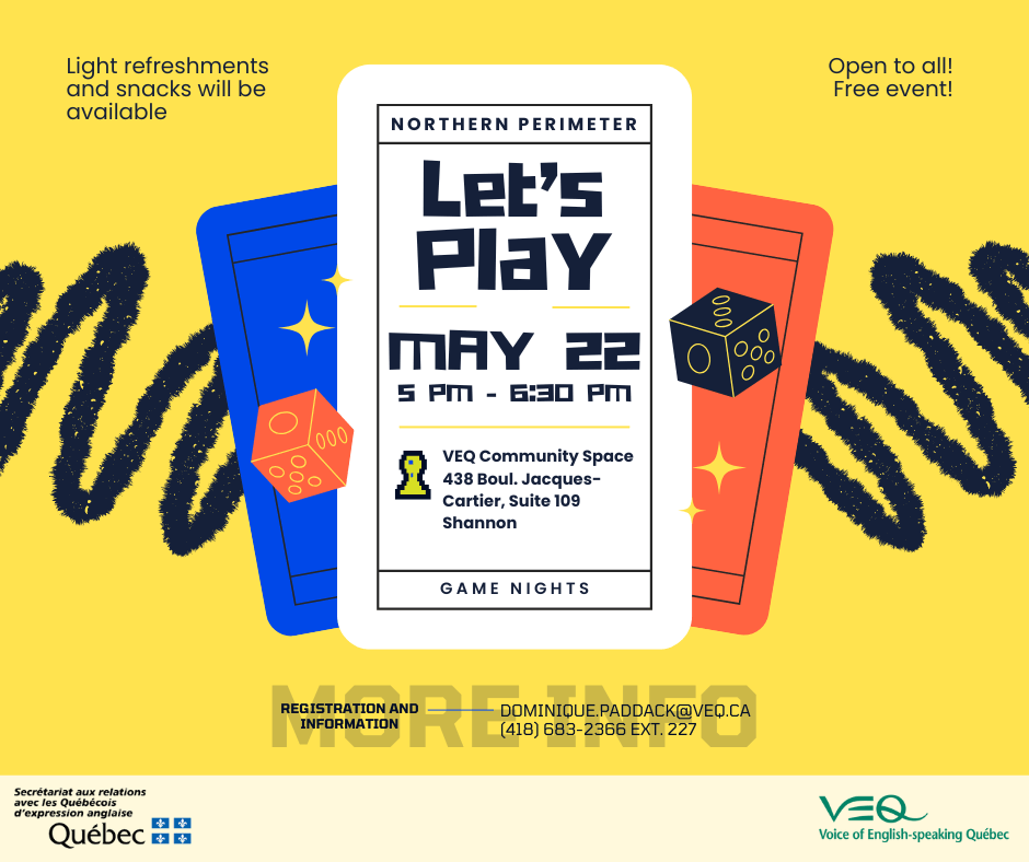 Come play your favourites board and card games atVEQ Community Space! Enjoy the early evening in a fun theand relaxed setting, refreshments and snacks will be offered. Qwirkle, Trivia games, Sorry, Monopoly, Connect Four, Chess, Dominoes, Tri-Ominoes! Blokus, Uno, Skip-Bo, Scattegories, and much, much more! Bring your own game or discover new one’s while getting to know one and other.